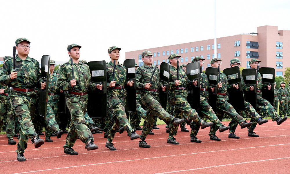 军训会操中,各方队都拿出了最佳状态,整齐划一的男子方队、英姿飒爽的女子方队、气势如虹的警棍盾牌方阵,将百折不挠、坚定不移的军魂体现得淋漓尽致。